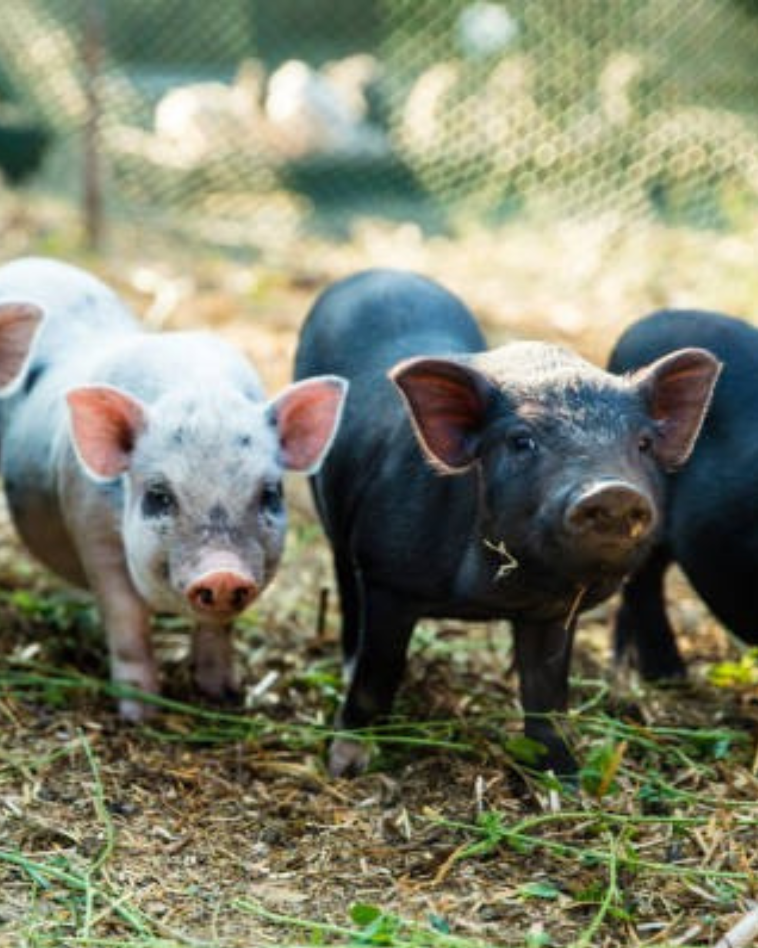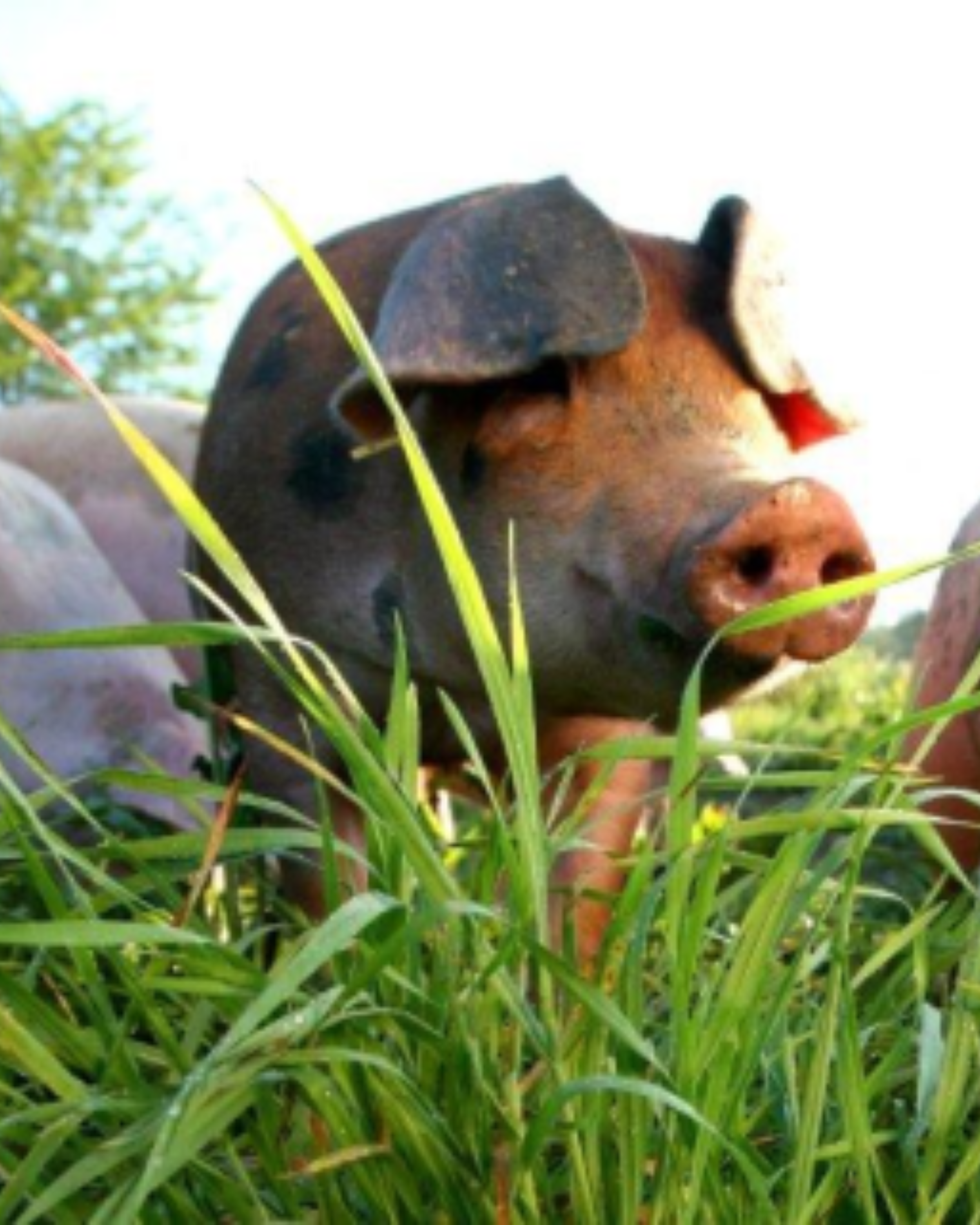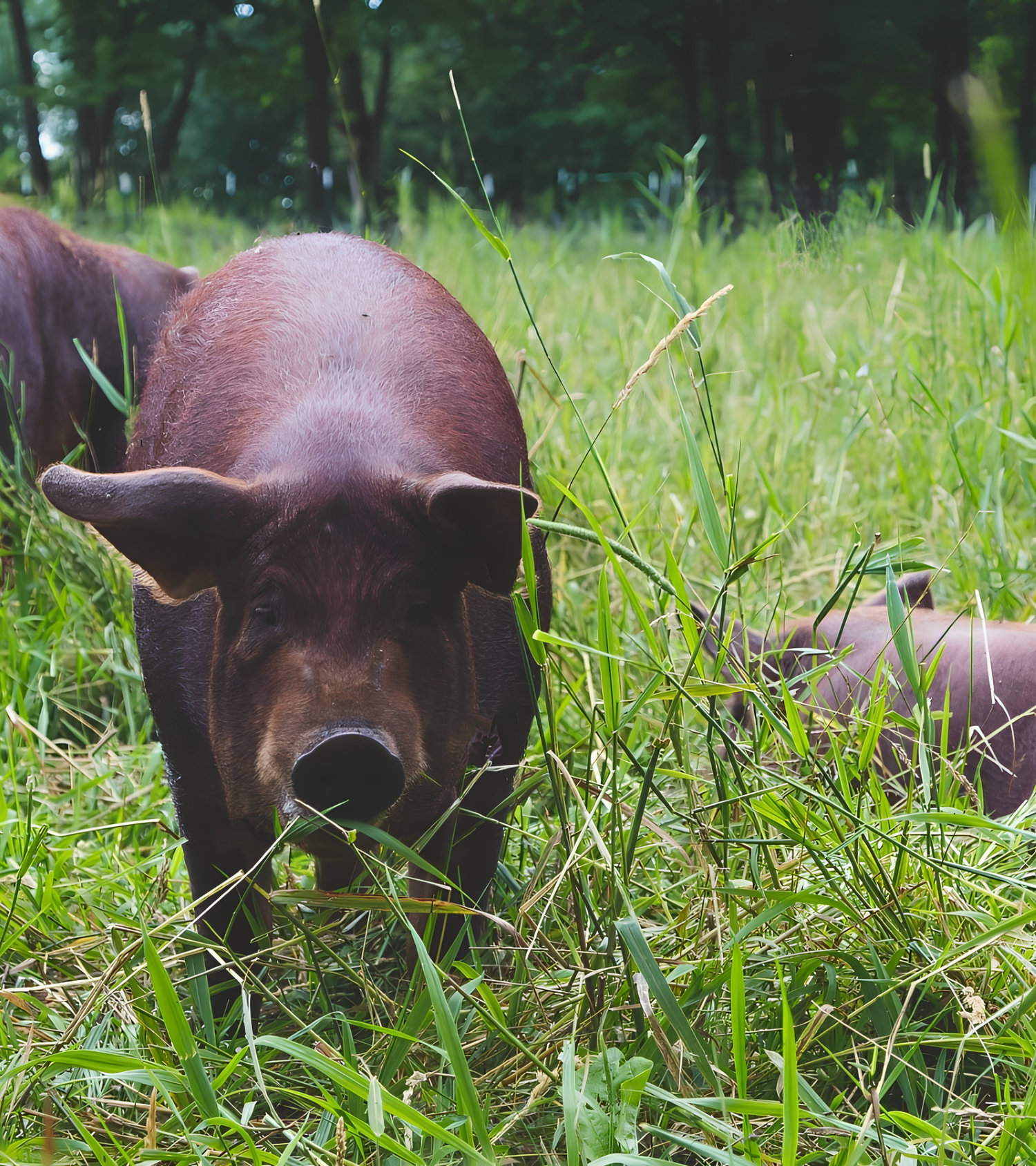 We raise heritage breeds that thrive outdoors…Hampshire, Old Spot, and Duroc because great pork starts with great genetics. Our pigs grow naturally, not accelerated through growth hormones and paylean, resulting in meat with real character: deep color, delicate marbling, and a lingering, nutty sweetness.